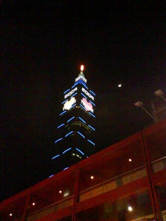 皎潔的月亮斜倚在台北101大樓旁,